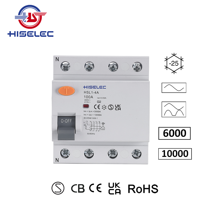 HSL1 series type A RCCB compliant to product standard IEC/EN 61008-1, IEC/EN 61008-2-1 and with the following main technical features: